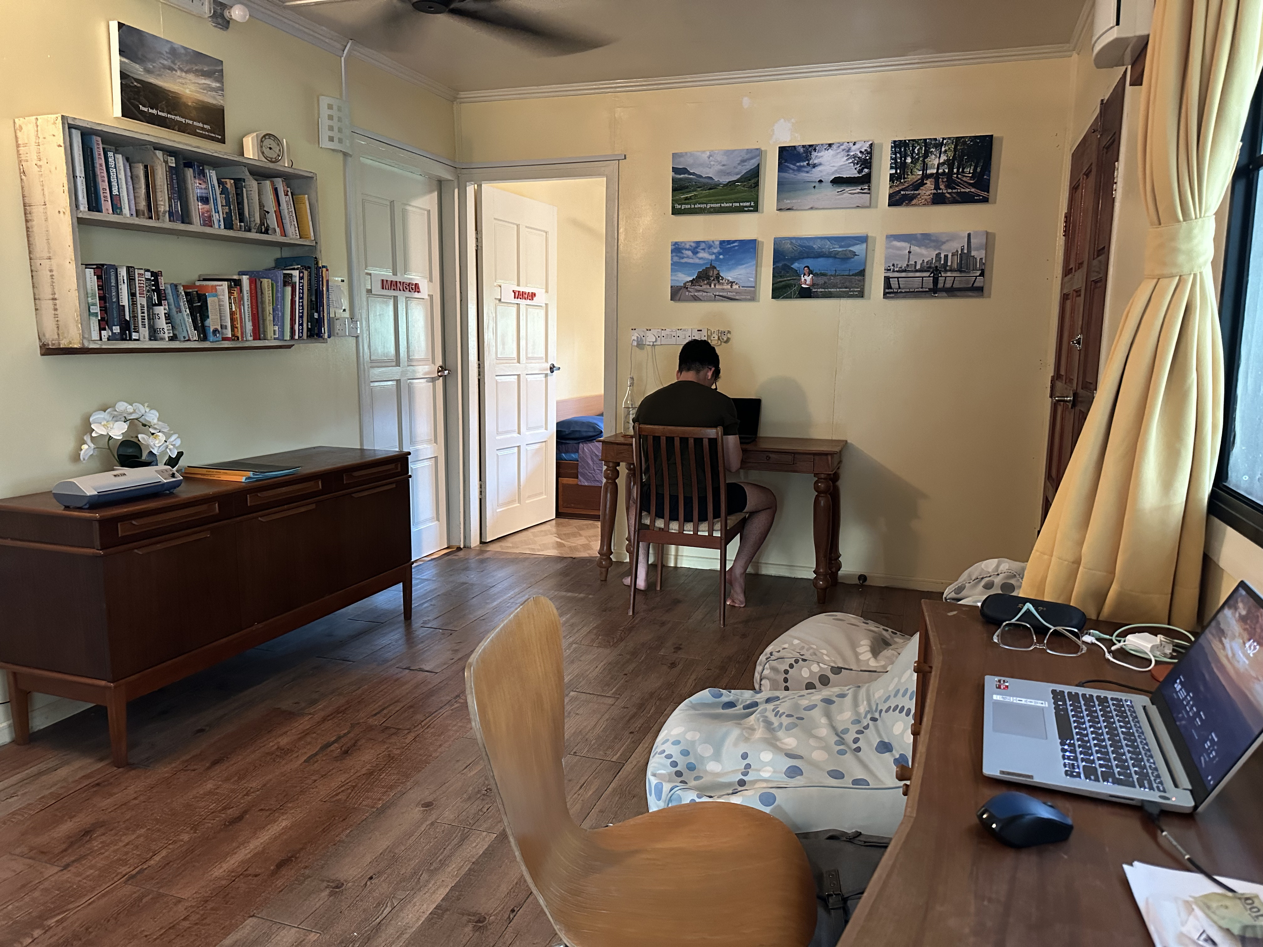 Formerly the TV and reading room. We still have books on the shelves for those who wish to switch off from digital world. You may set this space as your work room as there are tables and strategically located power points for devices.